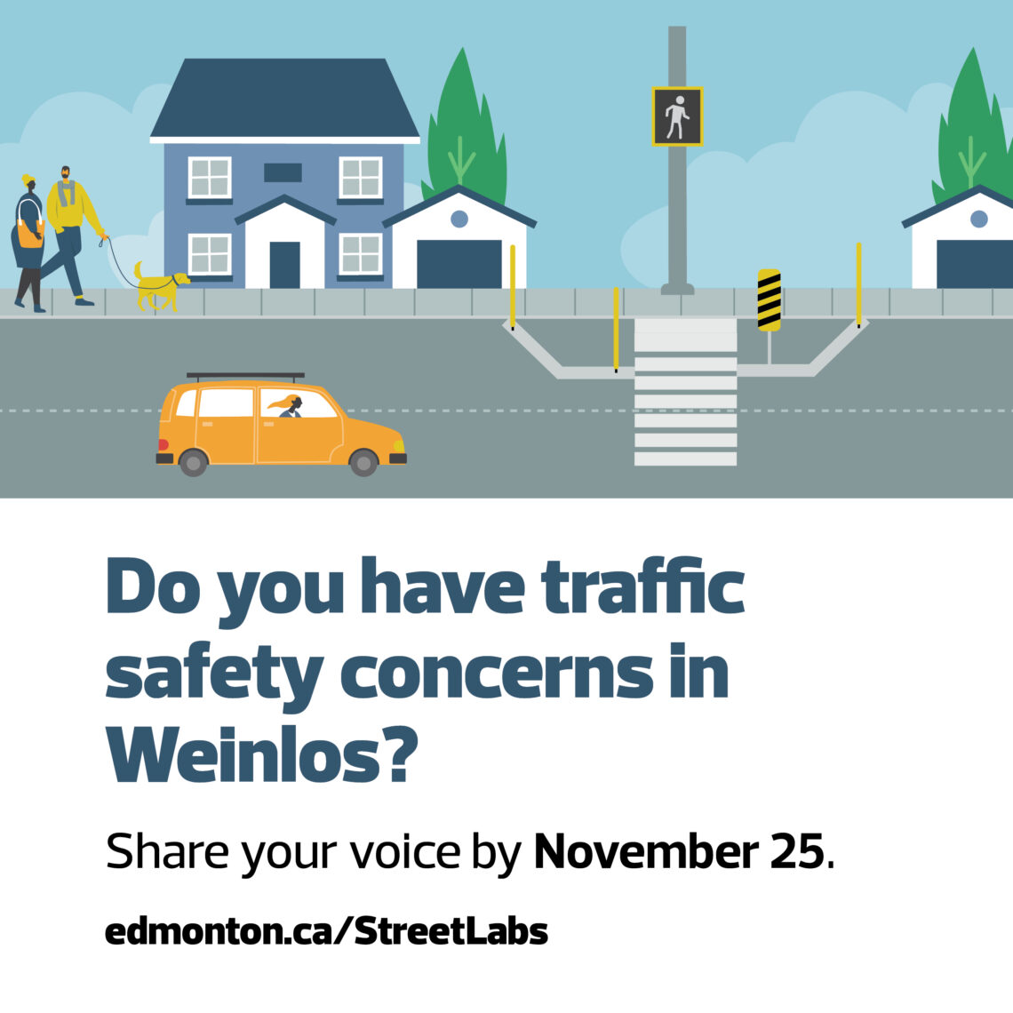 Weinlos has been selected for a Vision Zero Street Lab in 2026. To launch the project the City of Edmonton will be conducting public engagement from November 4 – 25, 2025.